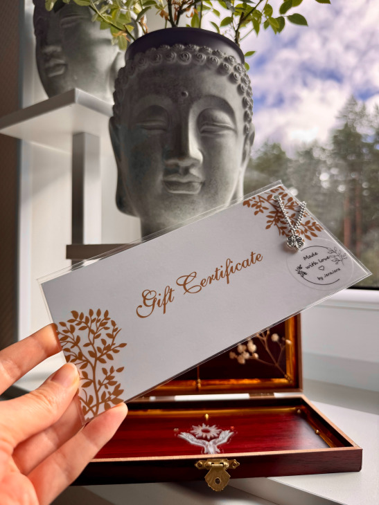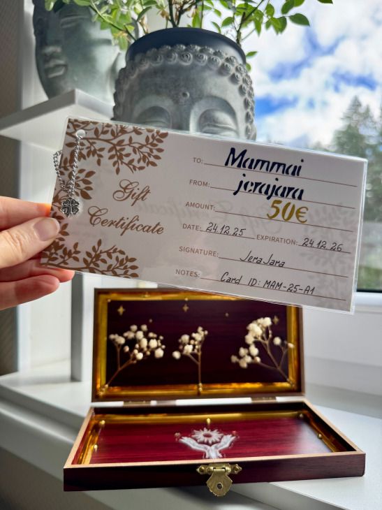 Šī dāvanu karte ir pieredze, sajūta un izvēle. Tā ļauj cilvēkam saņemt tieši to, kas viņam vajadzīgs šobrīd – zīlēšanas seansu, personīgi radītu talismanu vai citu maģisku pārsteigumu.