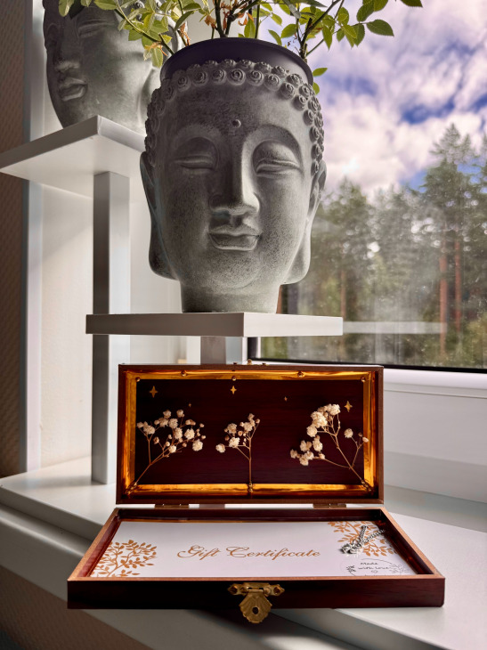 — Rokām darinātā kastītē – ar simbolisku ķēdīti un dabas elementiem (+8 €)