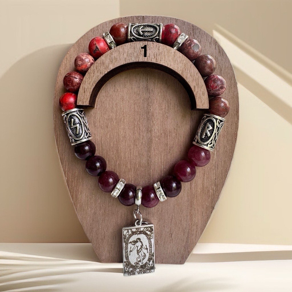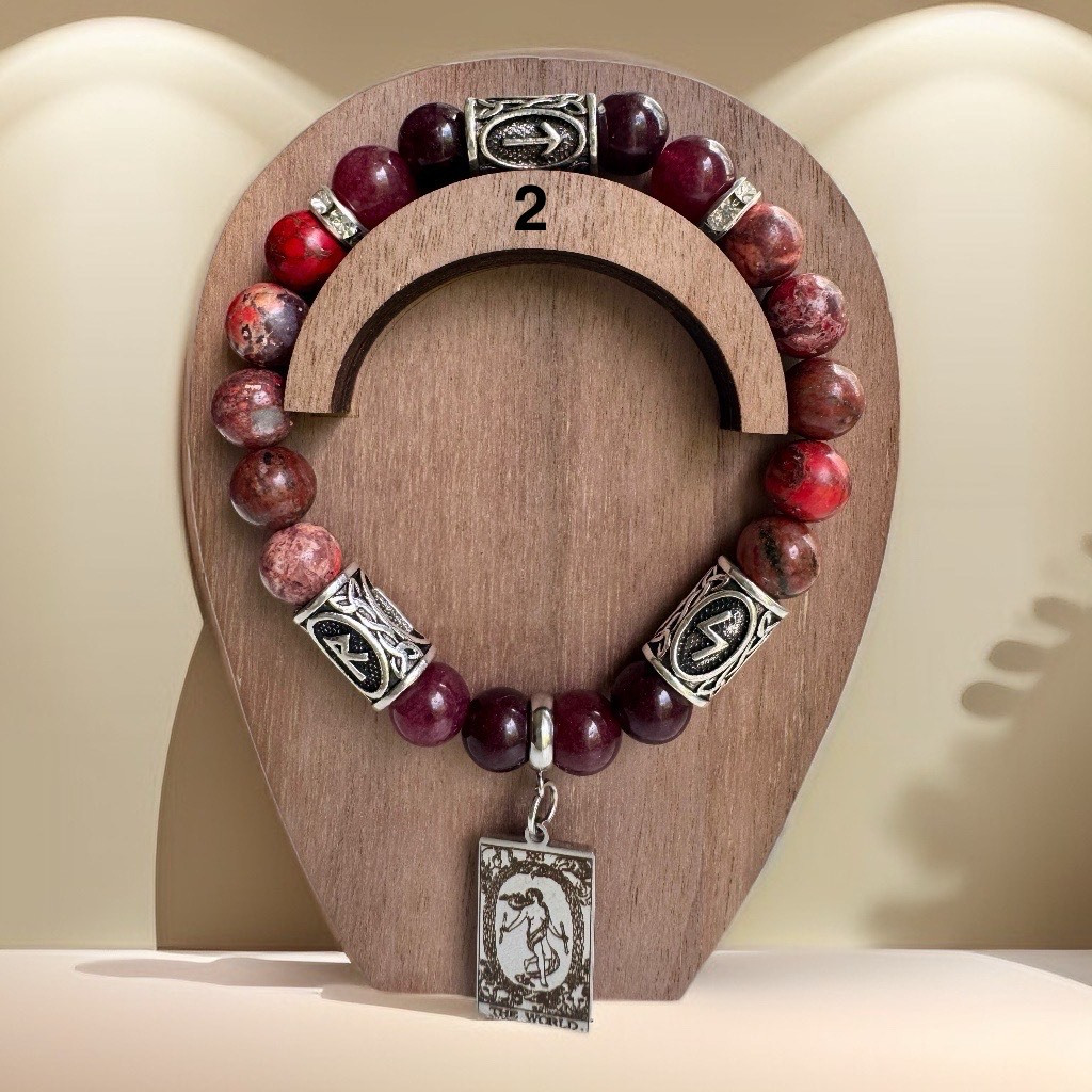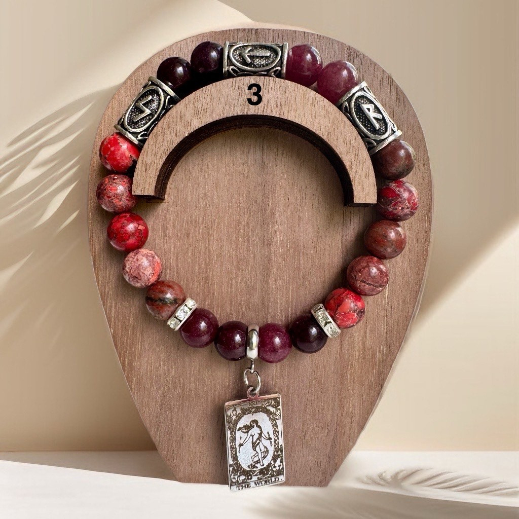 Šis talismans ir kā iekšējā uguns pavēlnieks – tas mostas brīžos, kad viss apkārt šķiet izkliedēts, bet Jums nepieciešama skaidra, nedalīta virzība. Granāts izsauc Jūsu dziļāko dzīvības kodolu, atverot durvis uz spēku, kas mīt dziļāk par nogurumu un šaubām. Tā nav vienkārši enerģija – tā ir uguns, kas jau dega Jūsos, bet bija apdzisusi aiz vilcināšanās putekļiem. Sarkanā jašma šo liesmu ietur rāmi, kā kluss bet nelokāms pavēlnieks. Tā neļauj spēkam izplūst, bet vada to kā strauju upi – pa noteiktu gultni, līdz galam. Tā palīdz saglabāt mieru pat steigā un dāvā skaidrību, kad viss jādara ar precizitāti un apziņu. Taro piekariņš Pasaule ir kā robežpunkts starp vēlmi un sasniegumu – tas palīdz Jums ne vien nokļūt līdz finišam, bet to izjust kā piepildījumu, ne izdegšanu. Šī enerģija vieno dažādus posmus vienotā ritmā, parādot, ka viss, ko Jūs paveicat ar klātbūtni un spēku, iegūst mūžīgu vērtību. Rūnu trīsvienība Sowilo – Tiwaz – Raidho veido neatlaidības, gaismas un kustības asi. Sowilo iededz Jūsu iekšējo sau­li, kad apkārt ir migla, Tiwaz nostiprina Jūsu ētisko stingrību un neatslābstošu apņēmību, bet Raidho palīdz Jums virzīties tālāk pat tad, kad ceļš šķiet sarežģīts. Šīs rūnas kopā kļūst par Jūsu iekšējo virzītāju – nevis haotisku spēku, bet apzinātu, mērķtiecīgu kustību.
