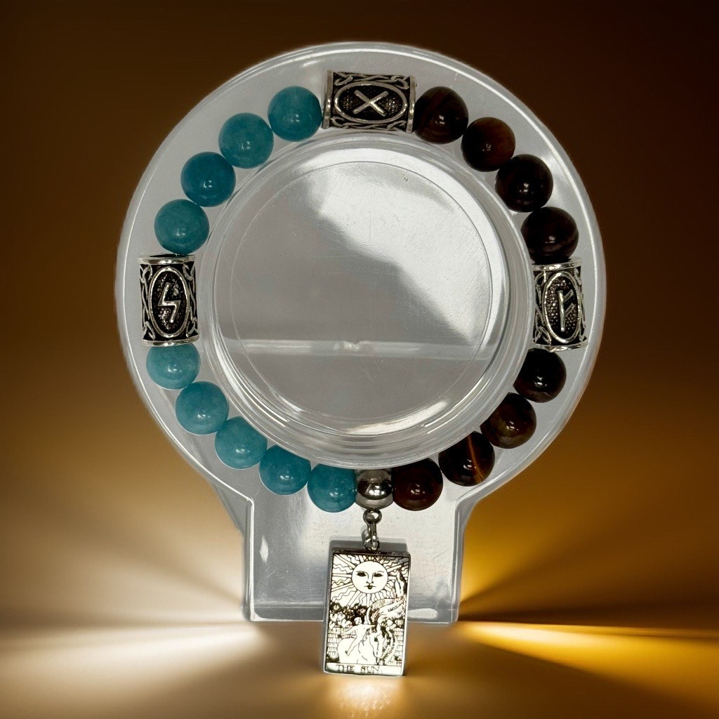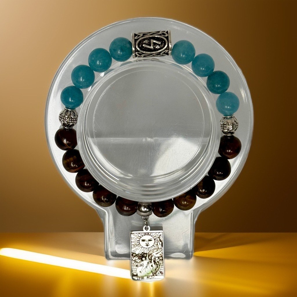 Šajā talismanā Saule arī savieno Tīģeraca un Zilā halcedona enerģijas vienotā, plūstošā spēkā. Tīģeraca drosmi un izturību tā apgaismo un pastiprina, pievienojot tam vieglumu un harmonisku plūsmu. Zilā halcedona mierīgo komunikāciju un sapratni tā uzlādē ar radošumu un spēju skaidri paust idejas, padarot sarunas pozitīvas un atvērtas panākumiem. Saule kā Taro simbols šajā talismanā palīdz radīt prieka un līdzsvara pilnu izaugsmi, kur profesionālie sapņi kļūst reāli un prieka pilni, izstaro apliecinājumu un drošību, ka izvēlētais ceļš ir tas īstais.